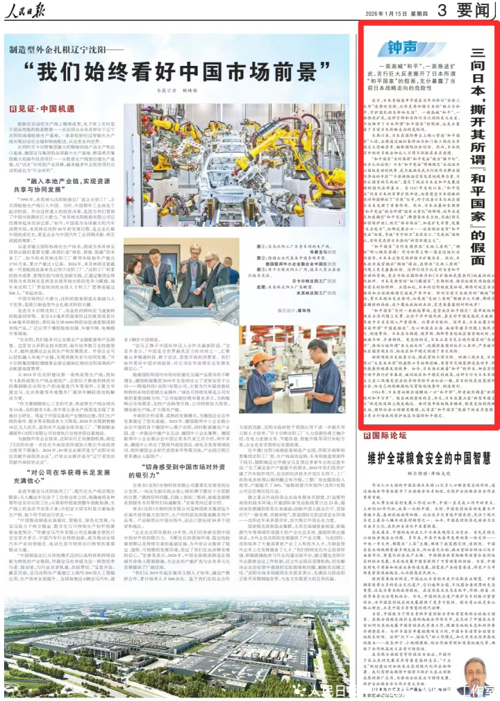 1954年,日本曾向联合国赠送一口“和平钟”,钟身赫然铸着“世界绝对和平万岁”。极具讽刺意味的是,今天,日本右翼正在“新型军国主义”的危险道路上越走越远。面对高市政权极其错误、极度危险的战略走向,国际社会必须擦亮眼睛,认清其“和平国家”假面下的真实意图,以有力行动共同维护地区与国际和平稳定。