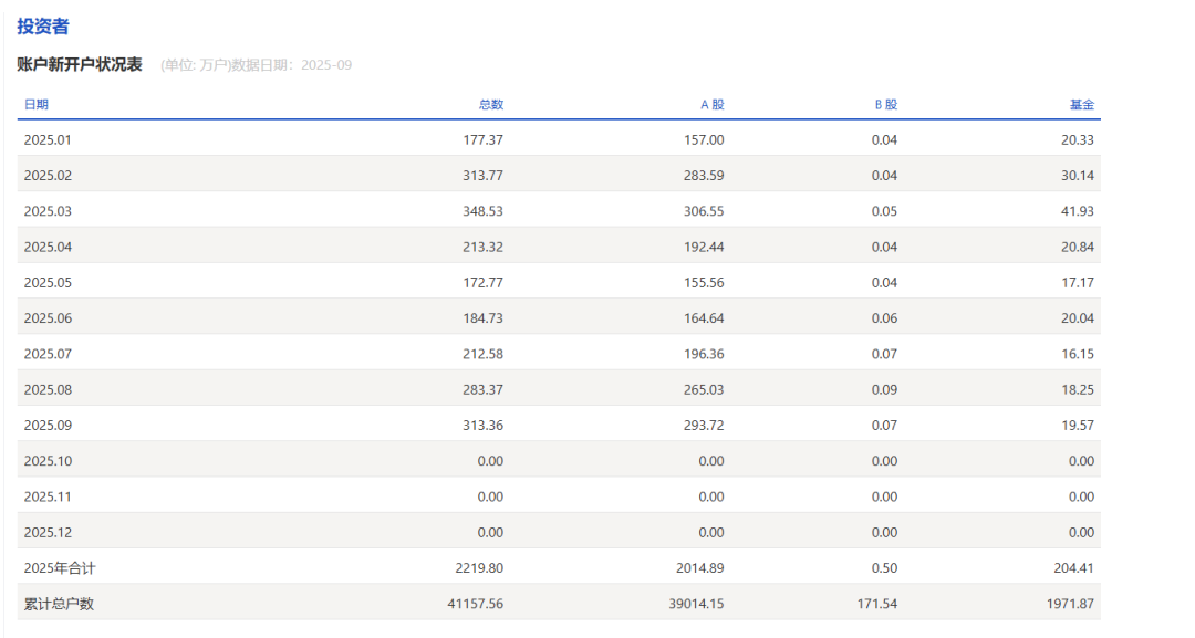 回看过去9个月,新开户数呈现波动上升的趋势。数据显示,2025年1月至8月,A股新开户总数分别为157万户、283.59万户、306.55万户、192.44万户、155.56万户、164.64万户、196.36万户、265.03万户。