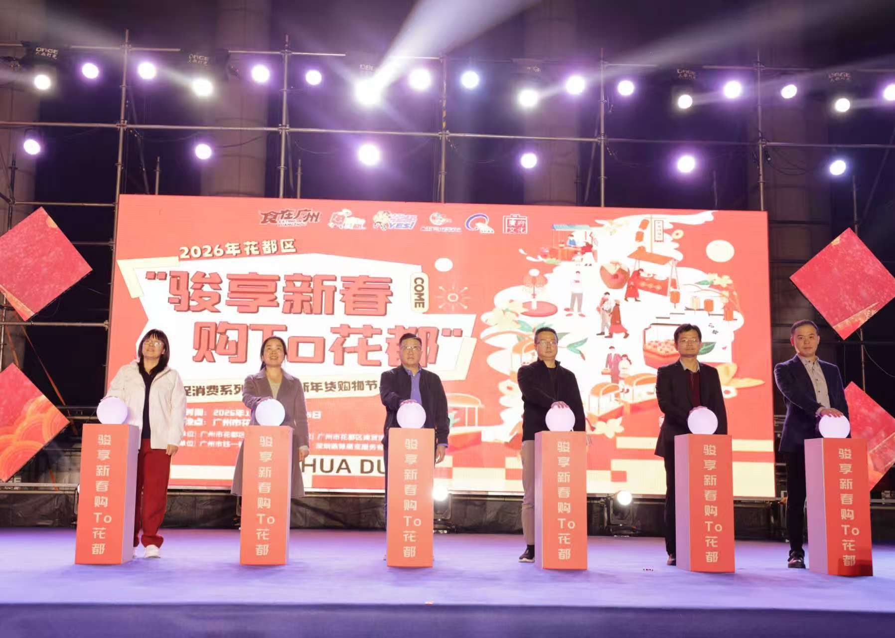 岁聿云暮,新元肇启;花都大地,商机无限。2026年1月12日晚,“骏享新春 购To花都”促消费系列活动——迎新年货购物节启动仪式在花都广场举行。花都区领导、相关部门负责人、参展商代表、媒体朋友与市民群众齐聚一堂,共同见证这场集商贸、文化、休闲于一体的新春消费盛宴正式启幕。