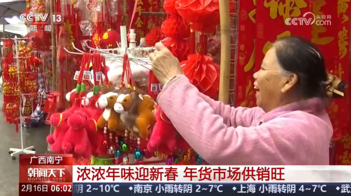 在广西南宁市上海路年货一条街,浓浓的年味扑面而来。红灯笼、中国结、对联等新春装饰品整齐摆放、格外醒目。商家们紧扣马年主题,推出各式各样的马元素装饰品供顾客挑选。 2026年的广西花鸟交易市场也十分热闹,迎春花市里数百种春季花卉吸引了不少市民前来挑选。