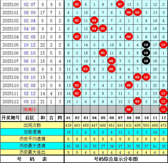 后区判断:上期后区奖号为09和12,开出热码+热码组合。最近十期后区开出11个热码、7个温码和2个冷码,本期预计奖号关注热码+热码组合,参考两码08、12。