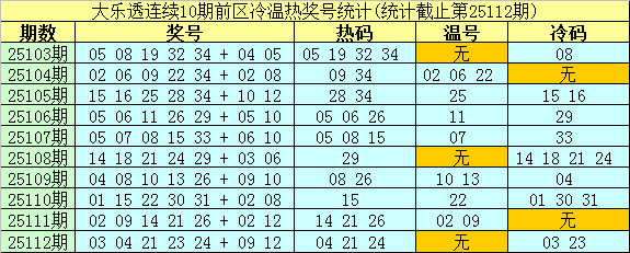 大乐透第25103期-第25112期前区奖号冷温热分布统计: