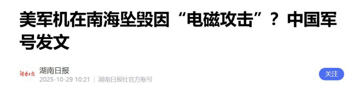 信源:湖南日报 美军机在南海坠毁因“电磁攻击”?中国军号发文